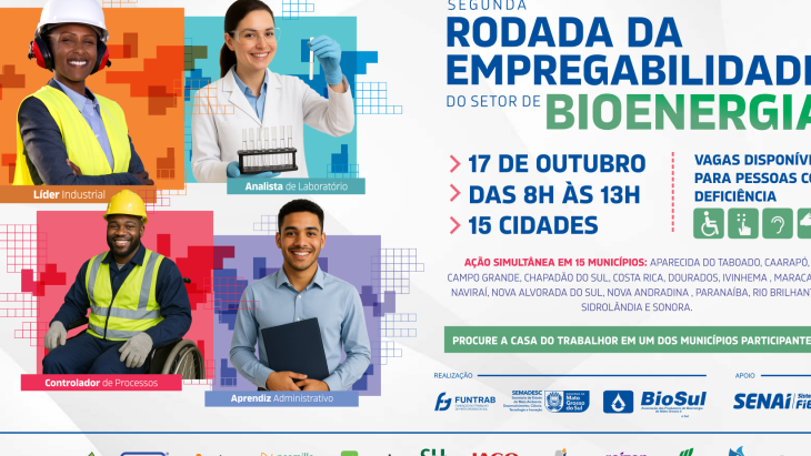 A Fundação de Trabalho de Mato Grosso do Sul (Funtrab) e a Associação dos Produtores de Bioenergia do Estado (Biosul), em parceria com o Senai/MS, realizarão na próxima sexta-feira (17) a 2ª Rodada da Empregabilidade voltada ao setor de bioenergia. A escolha da data é alusiva ao Dia da Bioenergia, comemorado nacionalmente em 19 de outubro, reforçando a importância do setor para a economia e o desenvolvimento de Mato Grosso do Sul.