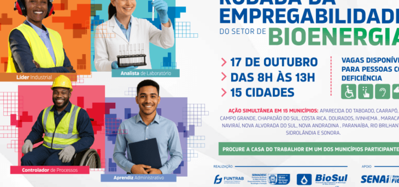 A Fundação de Trabalho de Mato Grosso do Sul (Funtrab) e a Associação dos Produtores de Bioenergia do Estado (Biosul), em parceria com o Senai/MS, realizarão na próxima sexta-feira (17) a 2ª Rodada da Empregabilidade voltada ao setor de bioenergia. A escolha da data é alusiva ao Dia da Bioenergia, comemorado nacionalmente em 19 de outubro, reforçando a importância do setor para a economia e o desenvolvimento de Mato Grosso do Sul.