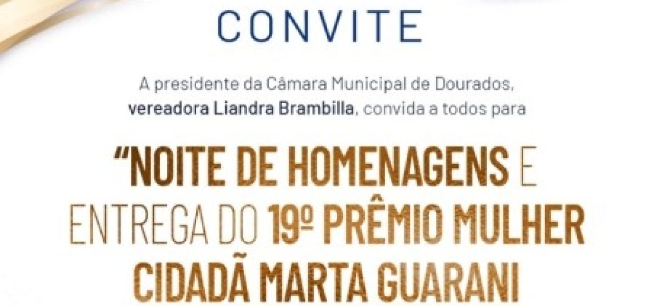 A Câmara Municipal de Dourados realiza, neste dia 31 de março, às 19h, a tradicional “Noite de Homenagens”, ocasião em que será entregue o Prêmio Marta Guarani 2026 à indígena Micheli Alves Machado, da Aldeia Bororó, na Reserva Indígena de Dourados (RID).
