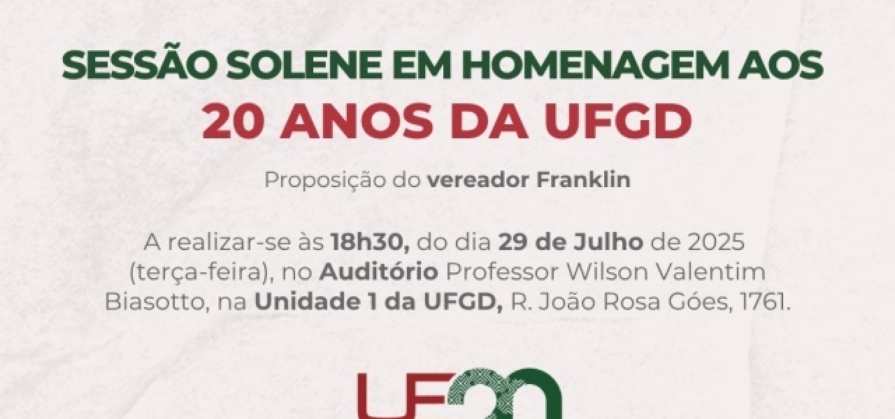 A Câmara Municipal de Dourados realizará, na próxima terça-feira (29), uma Sessão Solene em homenagem aos 20 anos da Universidade Federal da Grande Dourados (UFGD). A solenidade, proposta pelo vereador Franklin Schmalz (PT), será realizada exatamente na data em que foi oficializada a criação da UFGD.