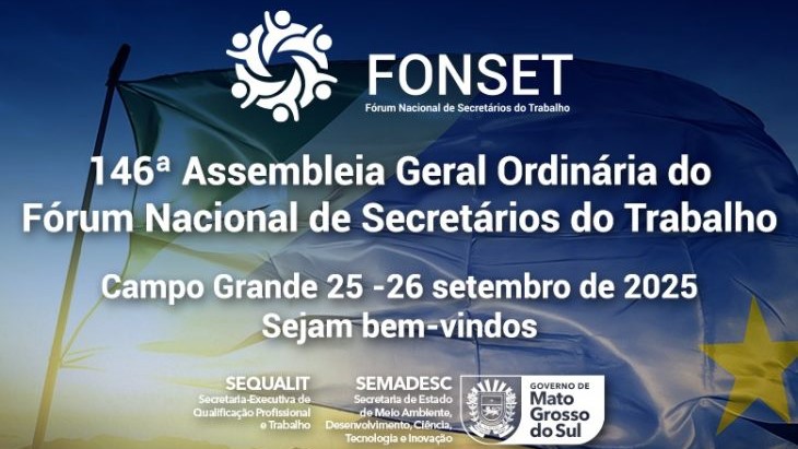 Campo Grande recebe quinta e sexta-feira (25 e 26) a 146ª Assembleia Geral Ordinária do Fórum Nacional de Secretarias de Trabalho (Fonset), reunindo representantes de todo o País para debater políticas públicas voltadas à geração de emprego, qualificação profissional e fortalecimento do Sistema Nacional de Emprego (Sine). O Fórum tem como objetivo promover o diálogo e fortalecer as políticas públicas trabalhistas nos estados.