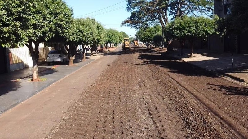 As máquinas também estavam em operação na rua Rio Brilhante, atuando nos cruzamentos com as ruas Araguaia e Itamarati, ampliando o alcance das melhorias viárias no bairro.