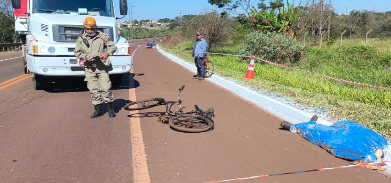 Ciclista, ainda não identificado, morreu atropelado por uma carreta Mercedes-Benz, na manhã desta quinta-feira (31/7), no Anel Viário que corta a MS-156, no trecho entre as avenidas Guaicurus e Presidente Vargas, em Dourados.