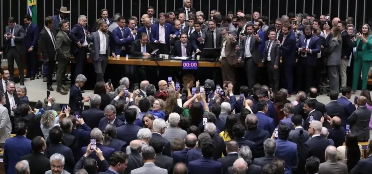 Ao chegar no plenário da Câmara, o presidente da Casa, Hugo Motta (Republicanos-PB), teve dificuldades de assumir sua cadeira na Mesa Diretora, impedido por alguns parlamentares, especialmente os deputados Marcel van Hattem (Novo-RS) e Marcos Pollon (PL-MS).