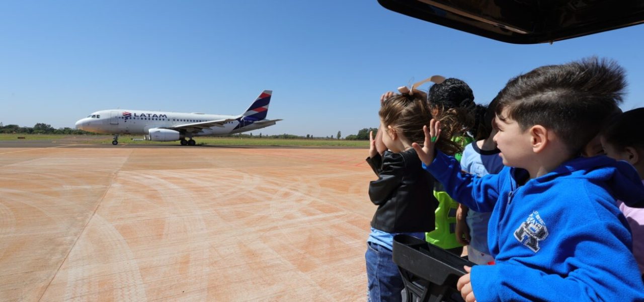 O brilho nos olhos dos alunos da Rede Municipal de Ensino começou já no trajeto até a pista de pouso e decolagem, e ganhou ainda mais intensidade ao avistarem de perto a imponente aeronave A319, Airbus da Latam Airlines. A admiração e a curiosidade tomaram conta do grupo.