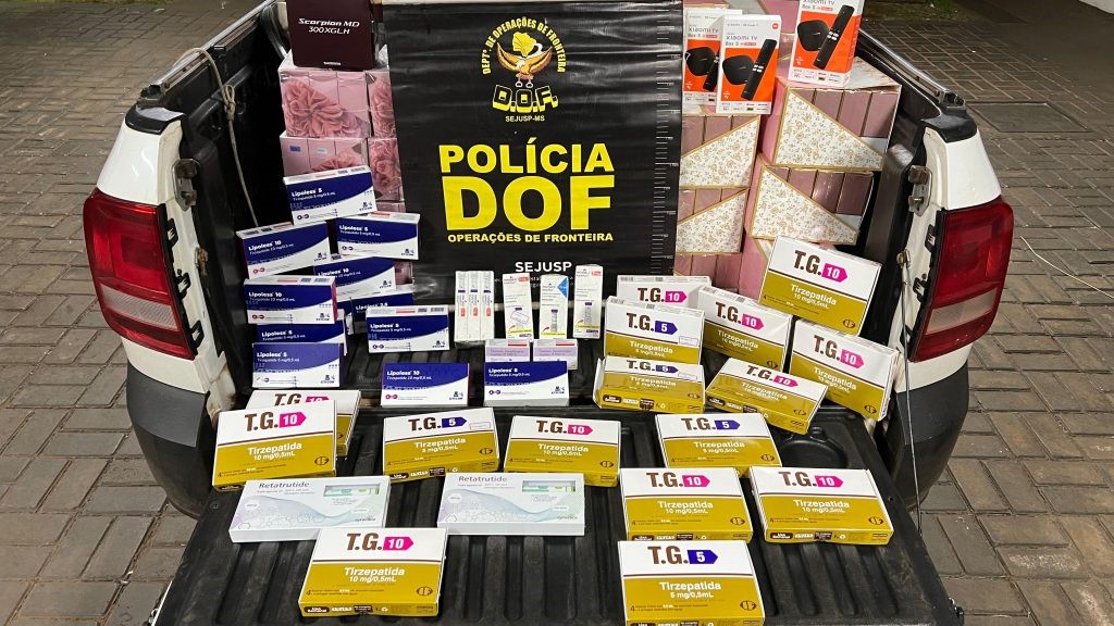 Os militares faziam bloqueio na MS-166, área rural do munícipio, quando abordaram o condutor. Na Saveiro, foram encontrados conversores de TV, frascos de perfume, canetas de mounjaro e outros medicamentos contrabandeados.