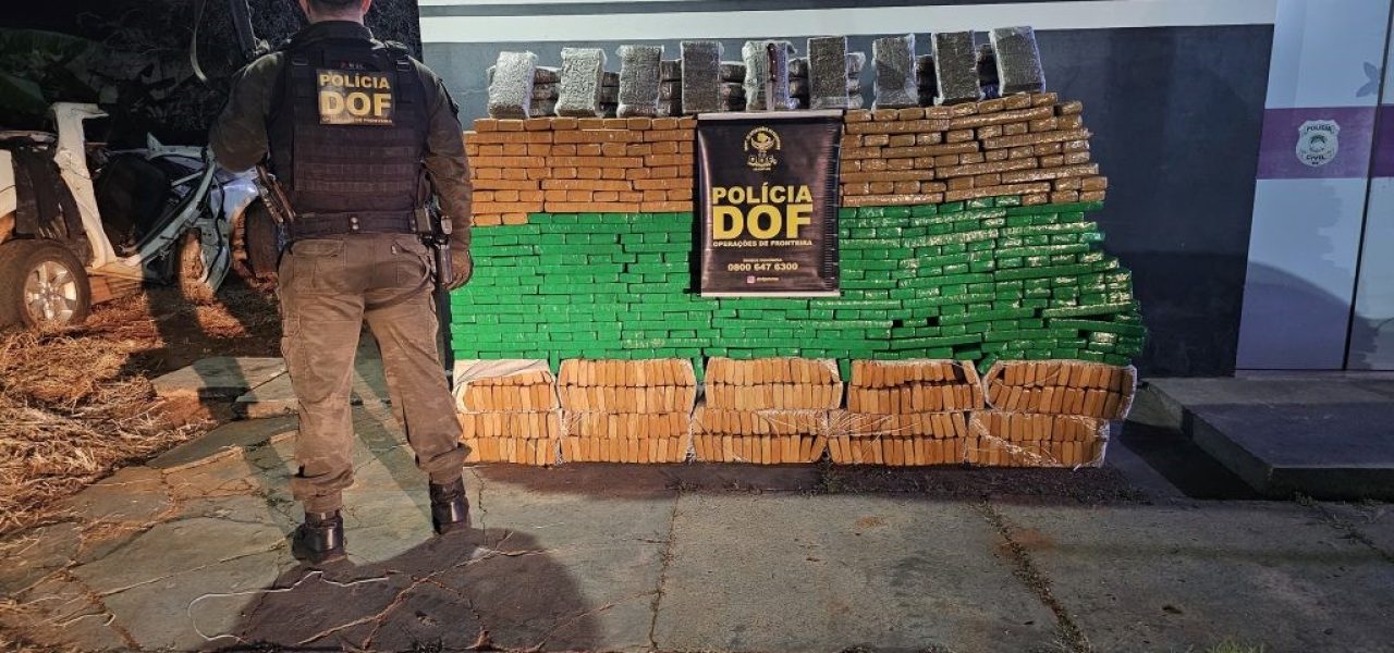 Em checagem dos agregados do veículo, constatou-se que o automóvel havia sido furtado na cidade de Campo Mourão (PR) no dia 12 de abril deste ano. No interior do carro, foram encontrados diversos tabletes de maconha e pacotes de skunk, totalizando aproximadamente 710 quilos.