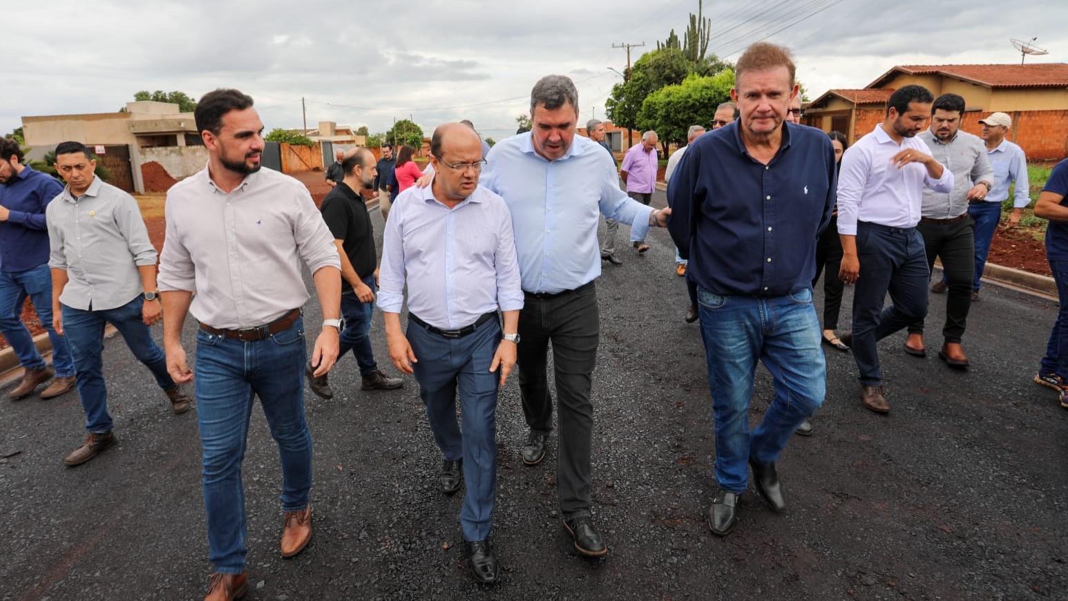 No período da tarde, as autoridades supervisionaram duas importantes obras de infraestrutura em Dourados. A primeira delas foi a restauração do pavimento, drenagem e sinalização viária do quadrilátero das ruas Cuiabá, Itamarati, Cafelândia e Ediberto Celestino. O investimento na região ultrapassa os R$ 21 milhões e tem como objetivo melhorar a mobilidade urbana e a drenagem pluvial na região do Grande Água Boa, beneficiando diretamente moradores e o tráfego local.