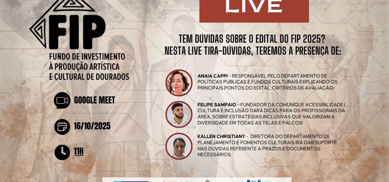A Prefeitura de Dourados, por meio da Secretaria Municipal de Cultura, realiza nesta quinta-feira (16) uma live especial para esclarecer dúvidas sobre o edital do Fundo Municipal de Investimentos à Produção Artística e Cultural (FIP). O encontro on-line tem o objetivo de orientar artistas, produtores e agentes culturais sobre as etapas de inscrição, critérios de avaliação e documentação necessária para participar da seleção.