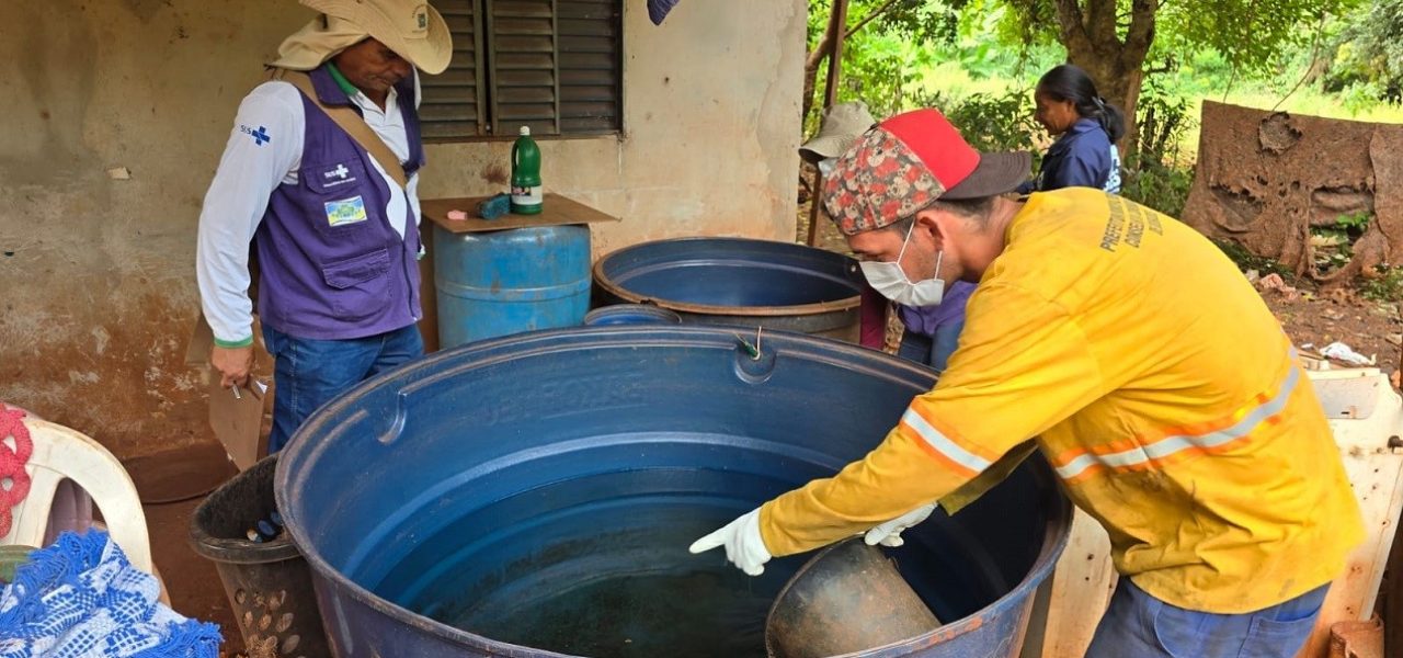 Nas primeiras casas visitadas na aldeia Jaguapiru, foram encontrados diversos focos do mosquito, principalmente em caixas d’água. Muitas famílias não possuem abastecimento regular de água e armazenam água da chuva. Mesmo nas residências com água encanada, a distribuição é irregular, o que faz com que moradores mantenham recipientes cheios por longos períodos.