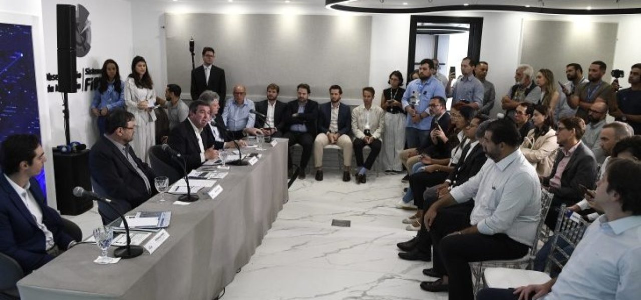 O governador Eduardo Riedel participou da coletiva de imprensa da FIEMS (Federação das Indústrias do Estado de Mato Grosso do Sul) – na manhã desta quarta-feira (7) –, onde foram apresentados o ‘Panorama Industrial’ e o Observatório da Indústria de MS, e foi anunciado o Fórum Lide COP-30, que será realizado em Bonito (no dia 30 de maio).