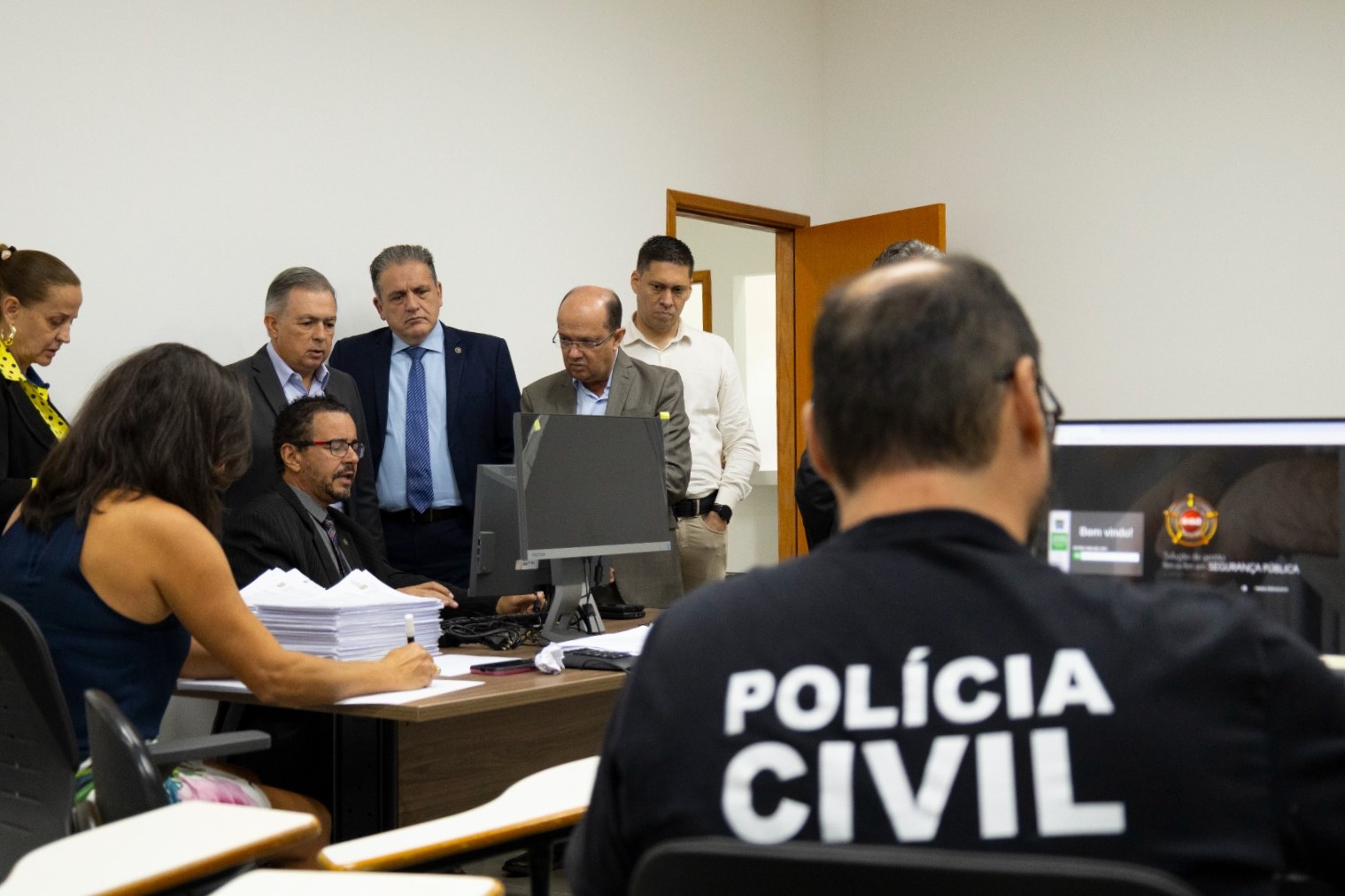 Na terça-feira (11), Barbosinha, acompanhado do secretário de Justiça e Segurança Pública (Sejusp), Carlos Videira, e do delegado-geral da Polícia Civil, Lupérsio Degerone Lucio, esteve na Academia de Polícia Civil (ACADEPOL) para acompanhar os avanços do Grupo de Trabalho (GT), criado para diagnosticar, aprimorar e agilizar investigações de crimes contra mulheres. Coordenado pelos delegados Márcio Rogério Faria Custódio e Maria de Lourdes Cano, o GT busca tornar mais eficiente o atendimento da Delegacia Especializada de Atendimento à Mulher (DEAM).