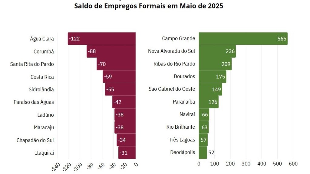 Na distribuição regional, os municípios com maiores saldos positivos de empregos formais foram Campo Grande (565), Nova Alvorada do Sul (236), Ribas do Rio Pardo (209), Dourados (175) e São Gabriel do Oeste (149).