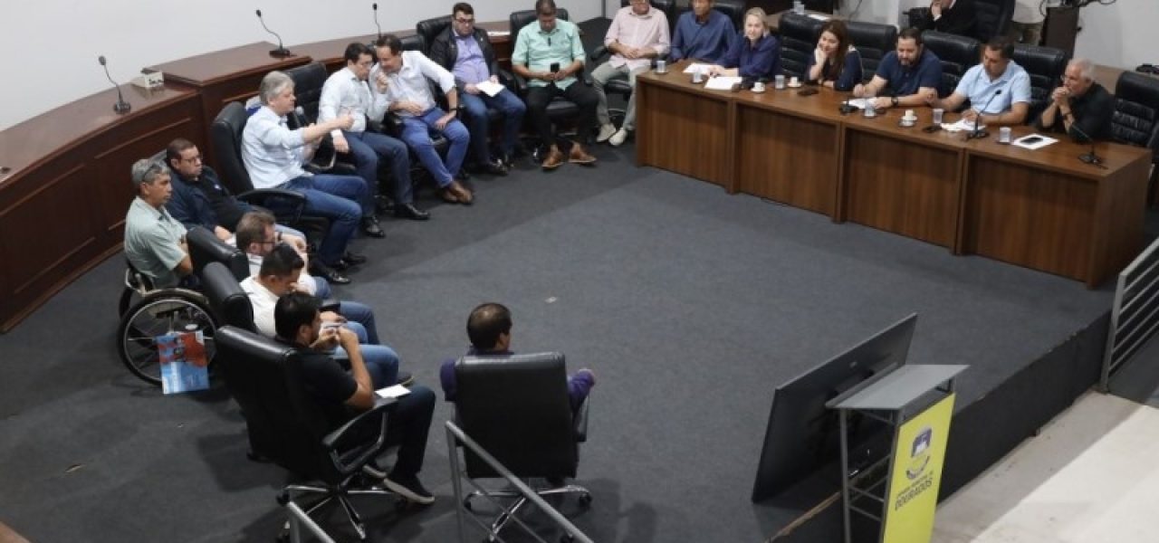 Os vereadores de Dourados receberam na manhã desta quarta-feira (4), o secretário estadual de Meio Ambiente, Desenvolvimento, Ciência, Tecnologia e Informação (SEMADESC), Jaime Verruck, o secretário de Estado Adjunto da Casa Civil, Walter Carneiro Júnior, e o secretário Executivo SEQUALIT, Esaú Aguiar. A reunião foi coordenada pela presidente da Câmara de Dourados, Liandra da Saúde (PSDB).