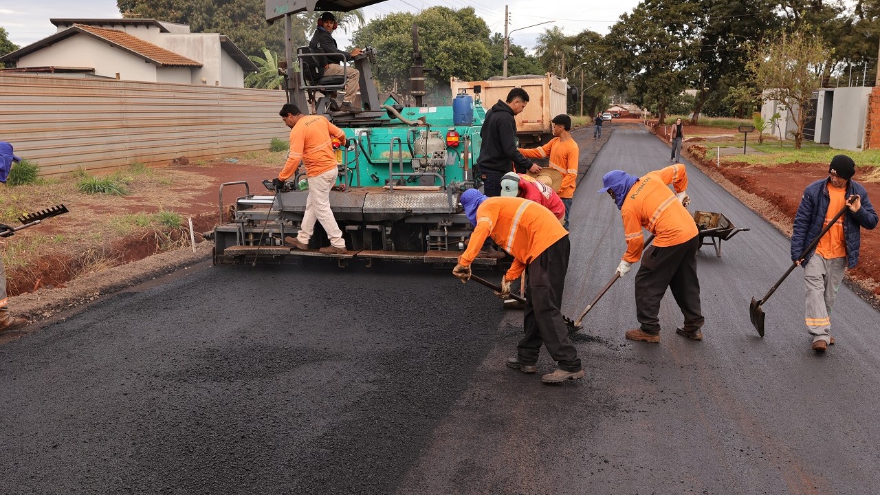 Avança a obra de pavimentação e drenagem no Jardim das Primaveras, em Dourados. Iniciado há 16 dias, o trabalho já está em fase de aplicação da massa asfáltica em um dos trechos e de construção de galeria pluvial em outro. O serviço contempla as ruas Alfio Senatore e Maria de Moraes Valente, nas proximidades do Hospital Universitário (HU).