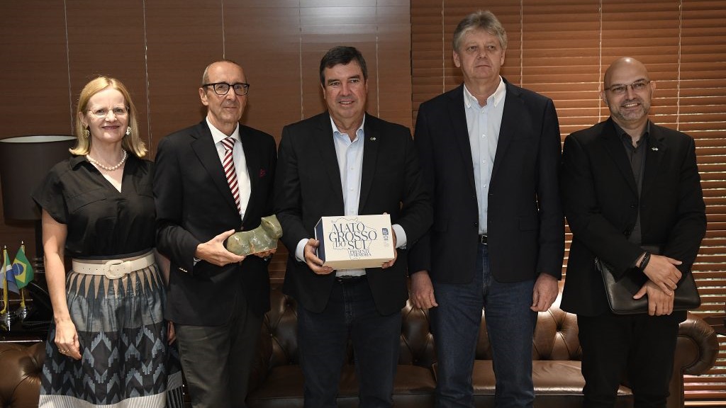 O governador Eduardo Riedel recebeu nesta quarta-feira (19) o embaixador da Áustria, Stefan Scholz, acompanhado da embaixatriz Angelika Scholz. Na visita a Mato Grosso do Sul, o chefe da missão diplomática austríaca no Brasil obteve informações importantes sobre o desenvolvimento econômico sustentável no Estado. A reunião foi uma oportunidade para a troca de experiências e possibilidades de estreitar as relações entre Mato Grosso do Sul e a Áustria.