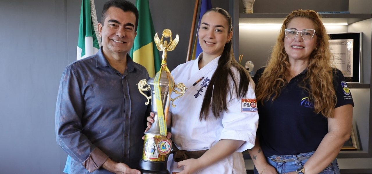 Nesta sexta-feira (16), o prefeito Marçal Filho recebeu no gabinete a atleta douradense Mirella Aguirre, de 18 anos, que vai participar do Campeonato Mundial de Karatê Shinkyokushin, em Tóquio, no Japão. Por meio da Fundação de Esportes de Dourados (Funed) a Prefeitura apoia a jovem, que tem se destacado no esporte nacionalmente e internacionalmente.