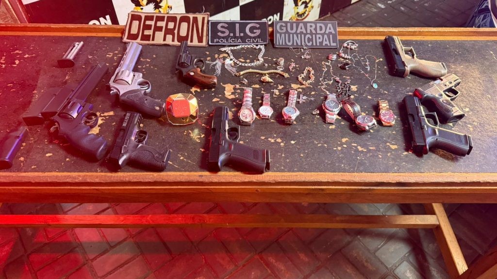 Durante a ação conjunta, os investigados tentaram fugir ao perceberem a aproximação policial. Houve resistência e confronto corporal. Um dos suspeitos foi preso no local e o outro capturado logo em seguida pela Guarda Municipal de Dourados. A equipe da SIG de Nova Andradina ingressou no imóvel utilizado pelos investigados, onde foram localizadas oito armas de fogo — entre pistolas e revólveres calibres .22, .357 Magnum, .38 e 9mm — todas acondicionadas em uma mala, além de diversos objetos subtraídos no furto ao Residencial Vila Nova.