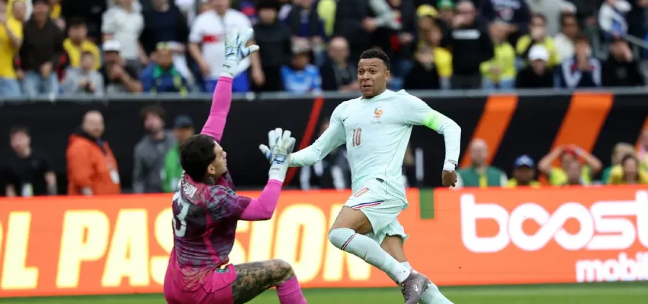Do outro lado, a França tinha mais volume de jogo, mas não necessariamente domínio. Wesley foi incansável na marcação e ofereceu pouco espaço para o avanço francês pela esquerda. Na outra ala, Léo Pereira e Douglas Santos faziam o que podiam para tentar parar Mbappé. E a dupla teve relativo sucesso até os 31 minutos, quando o craque francês recebeu lançamento de Dembélé, deixou o dois brasileiros para trás na velocidade e tocou por cobertura na saída de Ederson, abrindo o marcador.