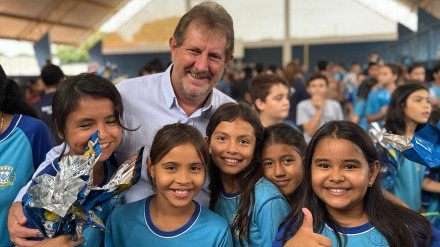 Com sorriso no rosto e atenção a cada detalhe, o prefeito fez questão de participar pessoalmente da entrega, demonstrando carinho e compromisso com a educação e com o bem-estar dos estudantes. A visita levou não apenas chocolates, mas também alegria e afeto a todos os presentes.