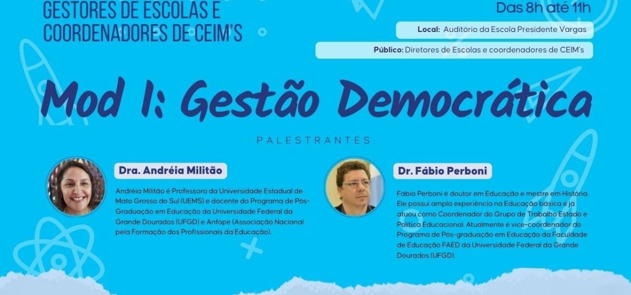 A Prefeitura de Dourados, por meio da Secretaria Municipal de Educação (Semed) realiza na próxima quarta-feira (30), a partir das 08h, no auditório da Escola Presidente Vargas, formação com o tema Gestão Democrática. A ação é voltada para diretores e coordenadores de unidades educacionais do município. O encontro marcará a abertura da formação continuada aos gestores educacionais da Rede Municipal de Ensino (Reme), tanto de escolas como de centros infantis (Ceims). A carga horária total prevista para a atividade é de 120 horas.