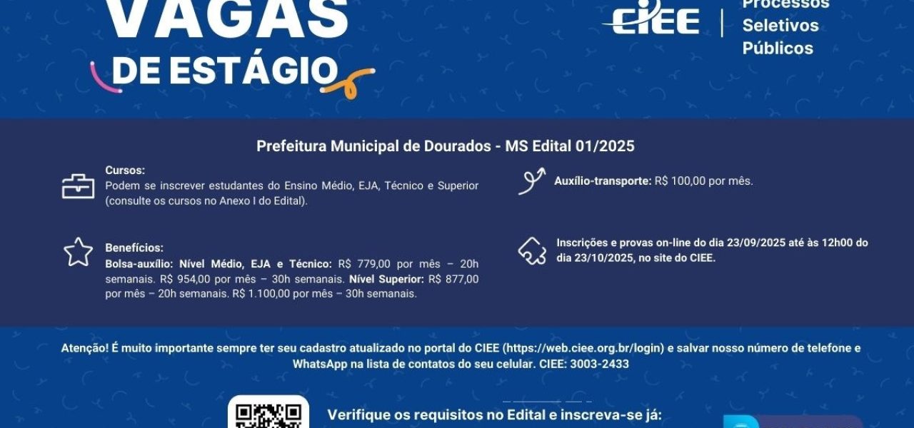 A Prefeitura de Dourados lançou o Edital nº 01/2025 para seleção de estagiários, em parceria com o Centro de Integração Empresa-Escola – CIEE. O processo oferece oportunidades para estudantes do Ensino Médio, Educação de Jovens e Adultos (EJA), cursos Técnicos e de Ensino Superior.