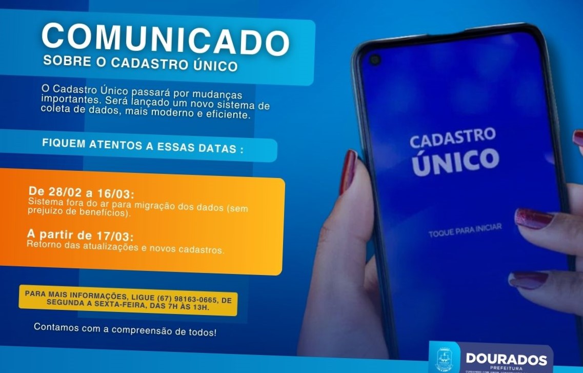 A Prefeitura de Dourados, por meio da Secretaria Municipal de Assistência Social (Semas), anunciou que o Cadastro Único (CadÚnico) ficará fora do ar entre os dias 28 de fevereiro e 16 de março. Durante esse período, não será possível realizar novos cadastros ou atualizações no sistema. No entanto, a suspensão não afetará a concessão de benefícios.