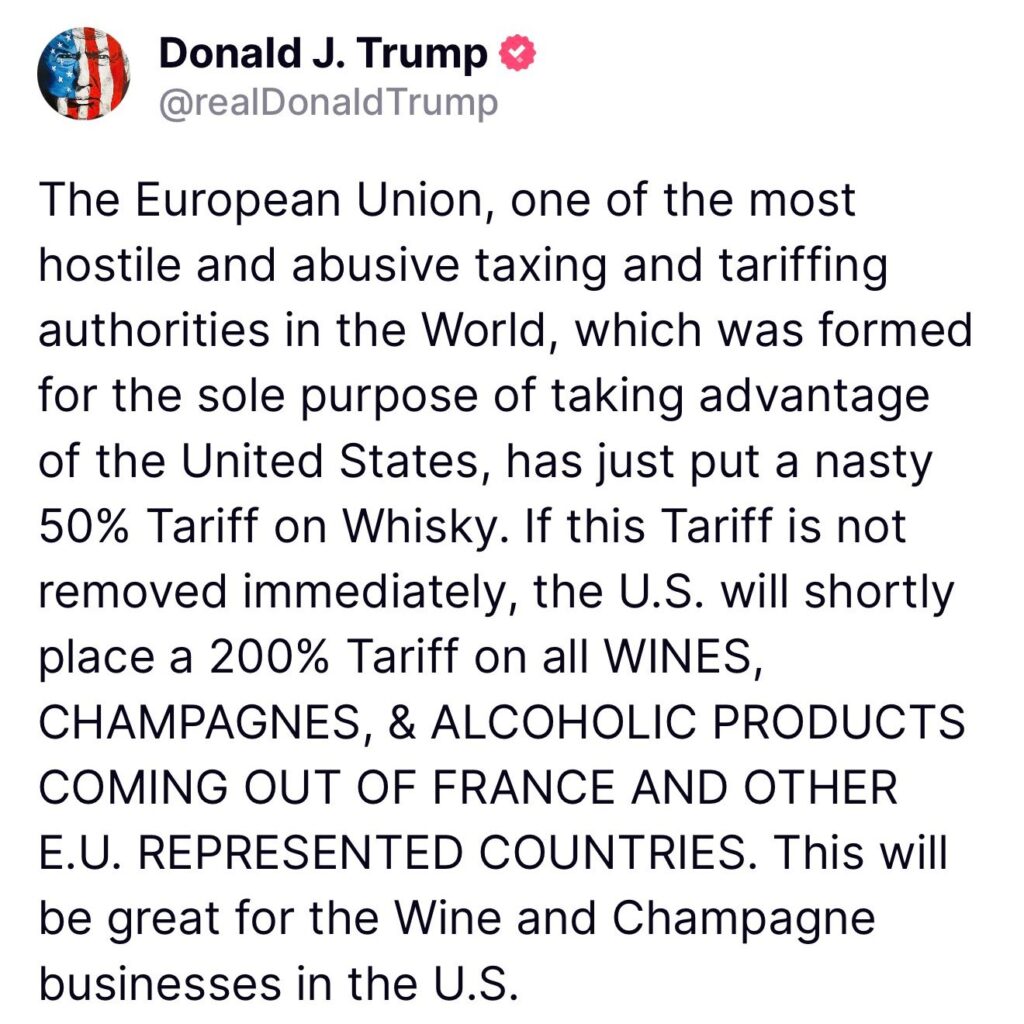 Em sua postagem, datada de 13 de março de 2025, Trump exigiu a imediata retirada dessa tarifa, sob pena de os EUA retaliar com uma tarifa de 200% sobre vinhos, champanhes e outros produtos alcoólicos provenientes da França e de outros países da UE. Ele sugeriu que essa escalada beneficiaria as indústrias de vinho e champanhe americanas, que poderiam ganhar espaço no mercado interno diante da restrição de concorrentes europeus. A ameaça reflete a estratégia de Trump de usar tarifas como ferramenta de negociação, uma prática recorrente desde seu retorno à presidência em janeiro de 2025.