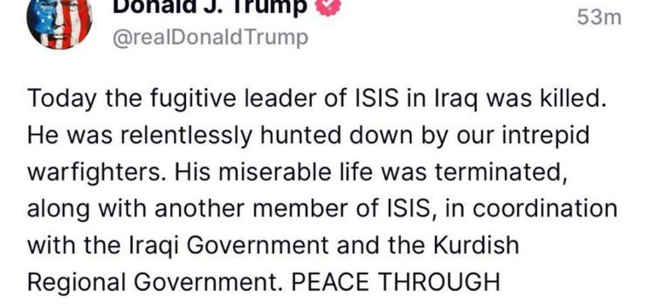 Na manhã desta segunda-feira, 17 de março de 2025, às 07:18 WET, o presidente dos Estados Unidos, Donald Trump, anunciou a eliminação de um líder fugitivo do ISIS no Iraque por forças americanas, em uma operação coordenada com o governo iraquiano e o Governo Regional Curdo. Em uma declaração veiculada por seus canais oficiais, Trump afirmou que o líder foi “implacavelmente caçado por nossos destemidos combatentes”, destacando que “sua vida miserável foi encerrada, junto com outro membro do ISIS”. Ele concluiu com a frase “PAZ PELA FORÇA!”, reforçando sua abordagem de segurança nacional baseada em ações militares contundentes.