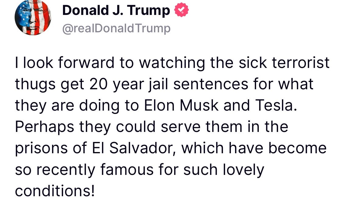 Trump expressou apoio à repressão em postagens nas redes sociais, afirmando estar “ansioso para ver esses terroristas doentes receberem sentenças de 20 anos pelo que estão fazendo a Elon Musk e à Tesla”. Ele também mencionou a possibilidade de transferi-los para El Salvador, onde o presidente Nayib Bukele tem adotado políticas duras contra criminosos, incluindo a construção do CECOT, que abriga dezenas de milhares de detentos em condições amplamente criticadas por organizações de direitos humanos. A sugestão reflete uma relação recente entre os dois países, após os EUA deportarem mais de 200 supostos membros de gangues venezuelanas para o CECOT em março de 2025, pagando 6 milhões de dólares ao governo salvadorenho.