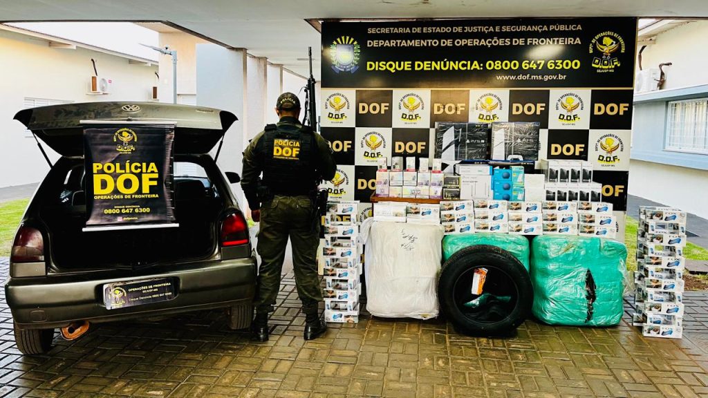 Policiais militares do Departamento de Operações de Fronteira (DOF) apreenderam na tarde desta terça-feira (3), um veículo VW Gol, de cor cinza, carregado com 150 pacotes de cigarros; 250 cigarros eletrônicos; vídeo game PS5; cartões de memória; roteadores; repetidor de Wi-Fi; pneus; e celulares. Na ação, um homem e uma mulher foram presos.