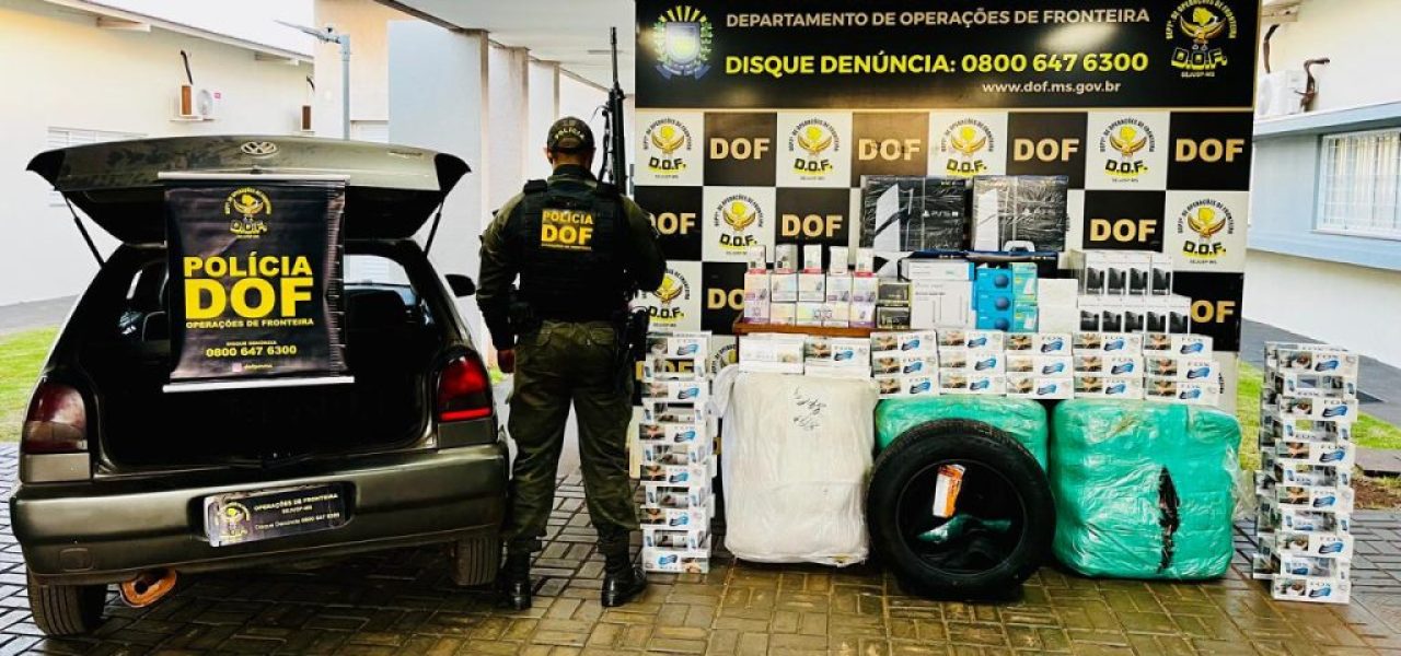 Policiais militares do Departamento de Operações de Fronteira (DOF) apreenderam na tarde desta terça-feira (3), um veículo VW Gol, de cor cinza, carregado com 150 pacotes de cigarros; 250 cigarros eletrônicos; vídeo game PS5; cartões de memória; roteadores; repetidor de Wi-Fi; pneus; e celulares. Na ação, um homem e uma mulher foram presos.