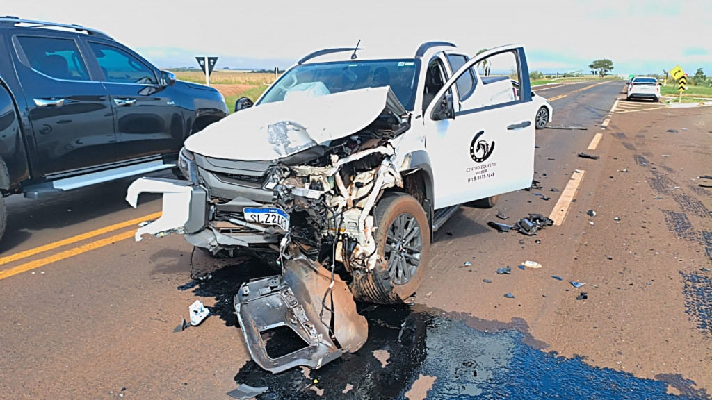 A colisão frontal envolveu os veículos Volkswagen Taos, de cor prata e placas SYE2E72, de Belo Horizonte (MG), e uma caminhonete Mitsubishi L200 Triton, branca, com placas SLZ2I01, de Dourados.